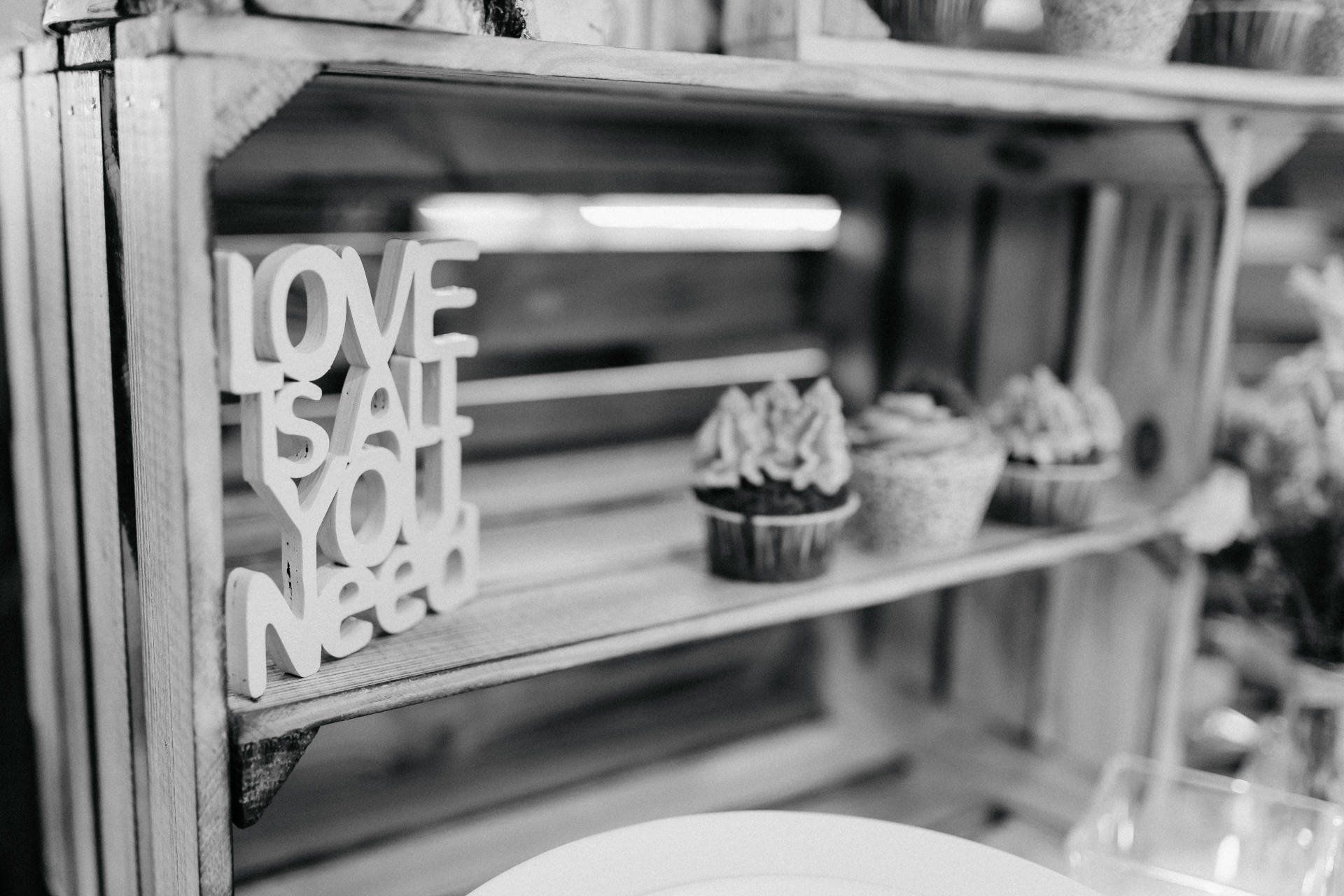 Dieser Schriftzug darf nicht fehlen. Ob auf dem Kuchenbuffet, beim Gästebuch oder der Fotobox, der Schriftzug unterstreicht das Motto des Tages!