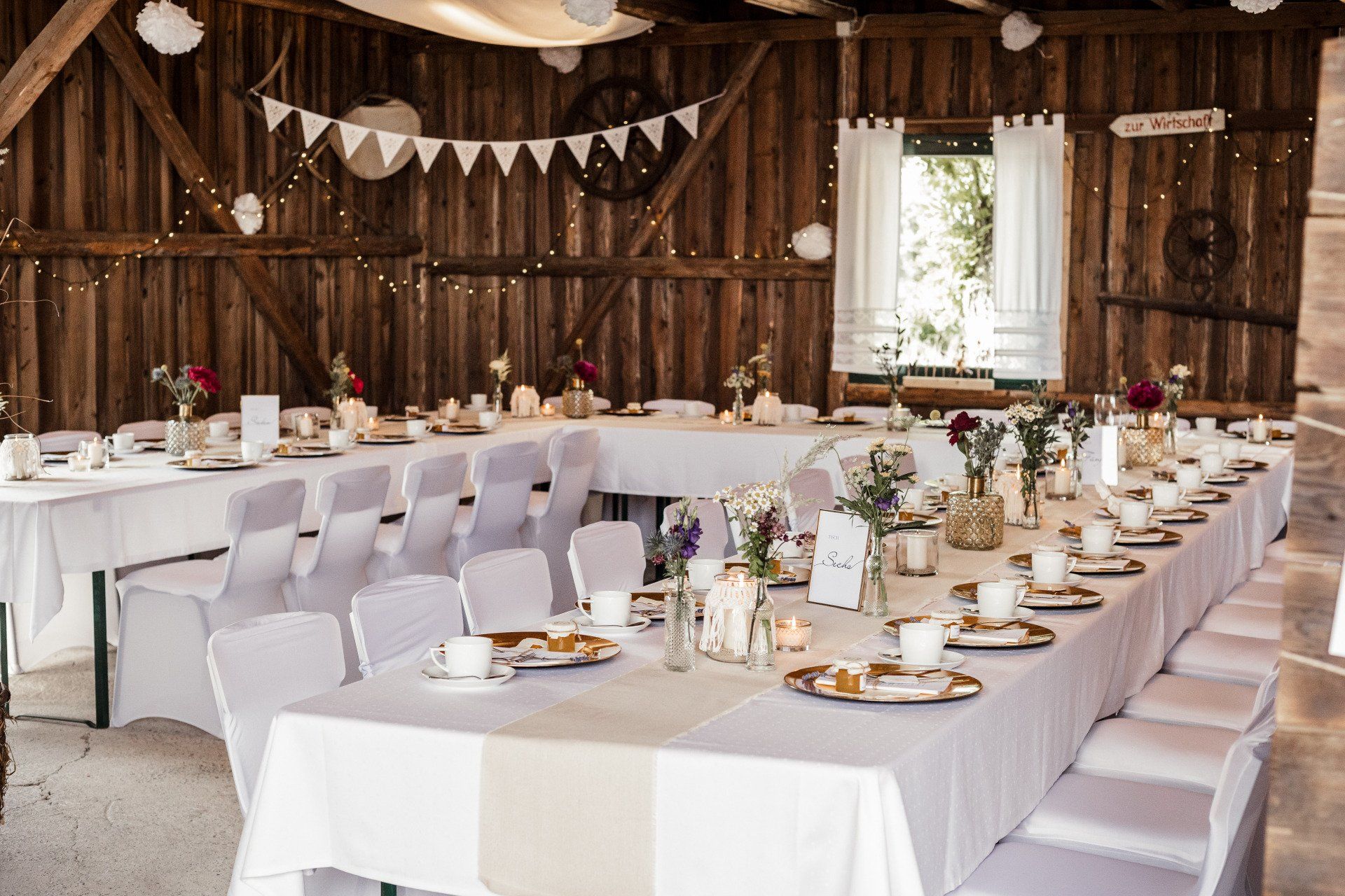 Überlegt euch eure Tischordnung und besprecht das mit eurer Location. Daraus ergeben sich dann die benötigten Längen.