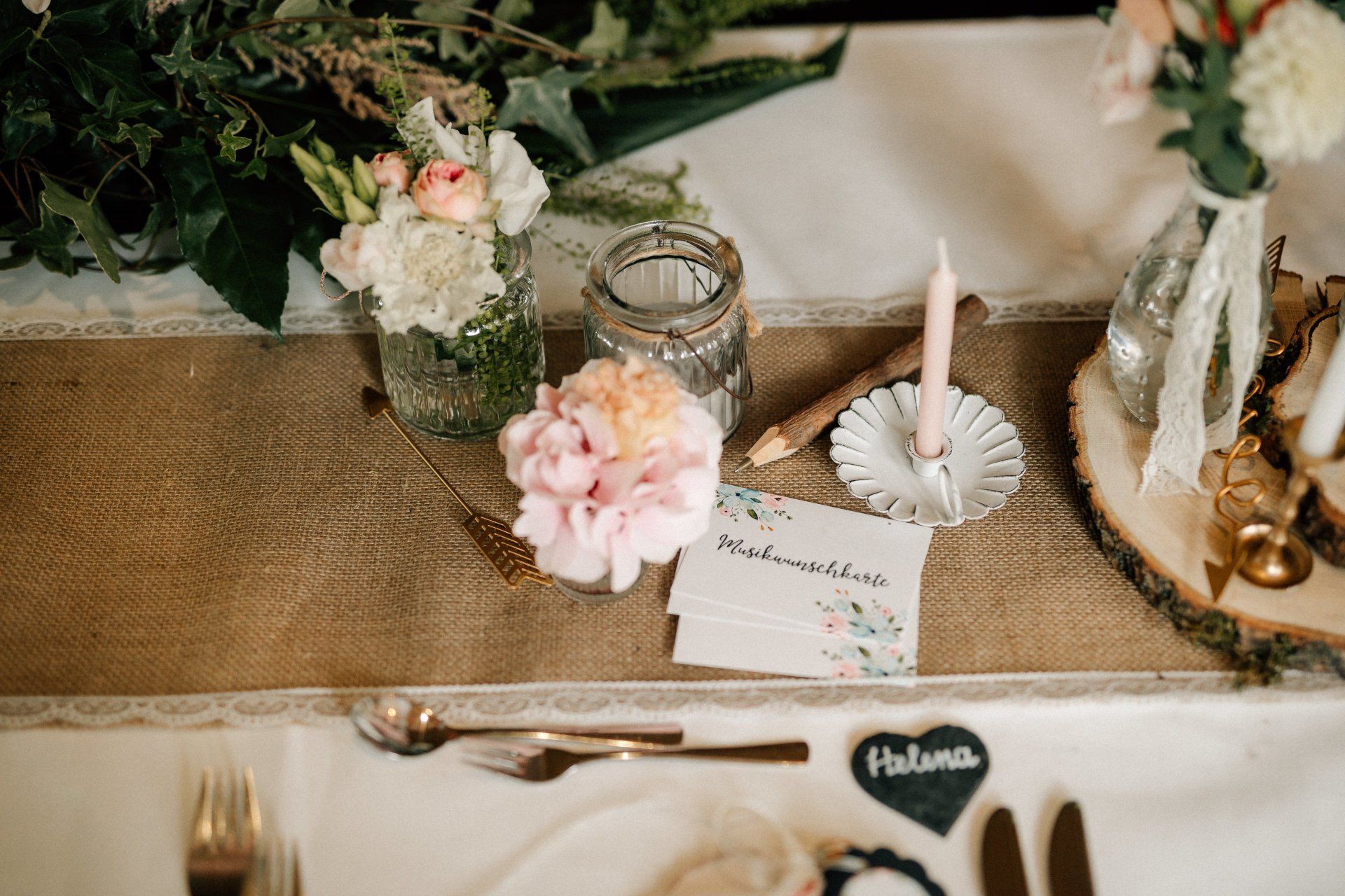 Perfekt für eine Vintagehochzeit eignet sich die Verbindung von Jute und Spitze. Diesen schicken Tischläufer haben wir in verschiedenen Längen.